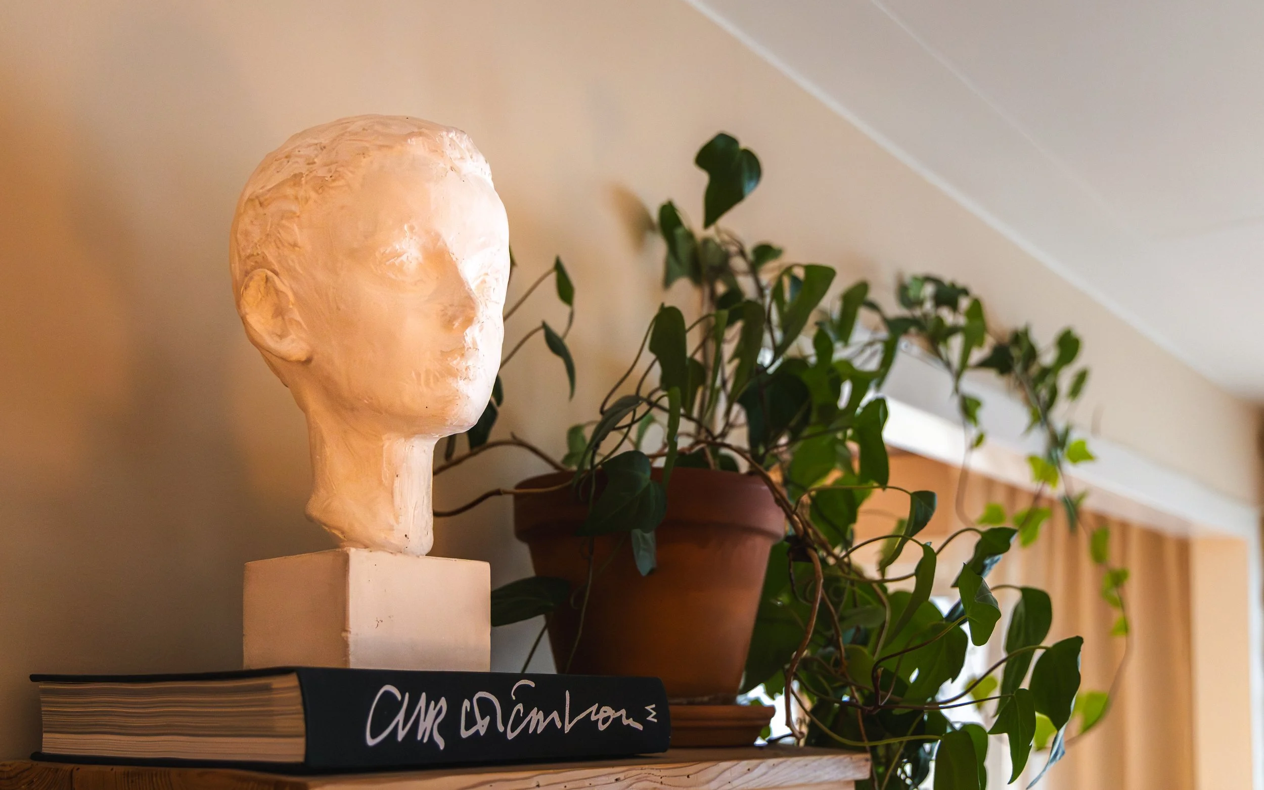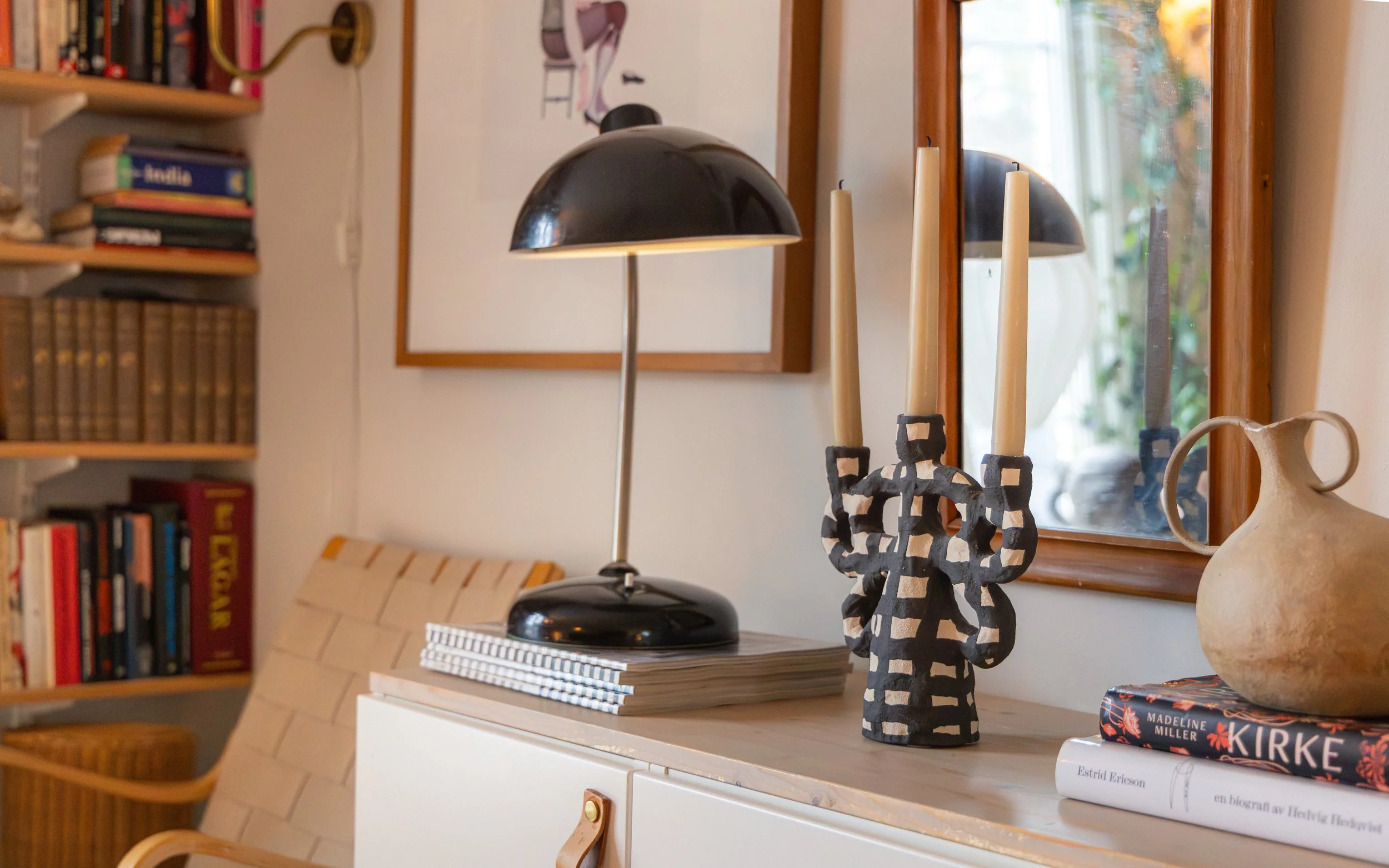 Frågar man Camilla vad som skiljer ett rum från ett hem, pekar hon mot väggarna. För henne är en tom vägg en förlorad chans till berättande. Tavelväggar, speglar, väggvaser och hängd dekoration bildar kompositioner snarare än dekorationer — de är rummets dramaturgi. Hemligheten, förklarar hon, är den röda tråden: tre till fyra färger som återkommer i allt från konst till textilier och håller samman det till synes eklektiska.